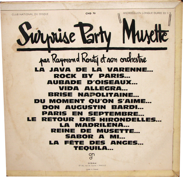 Raymond Routy Et Son Ensemble Musette - Surprise-Partie Musette Deja un comentario / Por Toni / 24 septiembre 2021 14 canciones La java de la Varenne Aubade d’oiseaux Rock By Paris Vida Allegra Brise napolitaine Du moment qu’on s’aime Don Augustin Bardi París en septembre Le retour des hirondelles La Madrilena Reine de musette Sabor a Mi La fête des anges Tequila