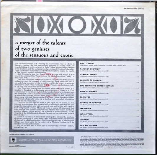 Don Tiare And His Orchestra Exotique – The Music Of Les Baxter (1963) Deja un comentario / Por Toni / 25 enero 2024 «a merger of the talents of two geniuses of the sensuous and exotic« 12 Canciones Quiet Village Bankok Cockfight Sampan Landing Crickets of Karachi Girl Behind the Bamboo Curtain River of Dreams Cockatoo Sunrise At Kowloon Jacaranda Jungle Trial Corazón Quai Bir Hackheim